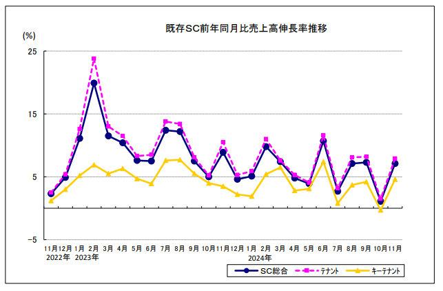11月度の既存SC売上高は、前年同月比7.1%増だった。中旬から気温が低下したことに加え、館の周年企画やポイント施策、ブラックフライデーなどのセールにより冬物商材が稼働した。