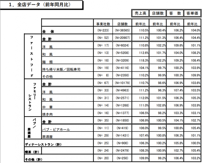 11月の外食全体の売上げは前年比110.5%、店舗数は100.4%、客数106.2%、客単価は104.0%。11月はファストフードやファミリーレストランを中心に各社キャンペーンが好調だったことや、訪日外客のインバウンド需要にも支えられ、外食は堅調だった。