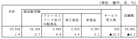 コンビニエンスストアの商品販売額およびサービス売上高は、1兆0534億円で1.9%増。店舗数は5万5976店で0.3%減少。商品別ではファストフードおよび日配食品が3844億円で0.8%増加、加工食品が2913億円で4.6%増加。非食品が3347億円で3.1%増加となった。サービス売上高は430億円で12.3%の減少となった。