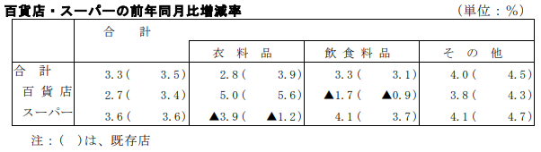 百貨店・スーパーを既存店でみると、3.5%の増加となった。百貨店は3.4%の増加、スーパーは3.6%の増加。