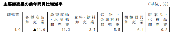 卸売業を業種別にみると、農畜産物・水産物卸売業が11.2%の増加、機械器具卸売業が同6.4%の増加、鉱物・金属材料卸売業が5.5%の増加、その他の卸売業が4.9%の増加、家具・建具・じゅう器卸売業が4.2%の増加。食料・飲料卸売業は3.7%増加、化学製品卸売業が3.3%増加、医薬品・化粧品卸売業が0.2%増加となった。一方、各種商品卸売業が11.0%の減少、繊維品卸売業が6.1%の減少、衣服・身の回り品卸売業が3.8%の減少、建築材料卸売業が3.4%の減少となった。