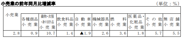 小売業を業種別にみると、織物・衣服・身の回り品小売業が10.7%の増加、その他小売業が5.7%増加、無店舗小売業が5.5%増加、燃料小売業が3.6%増加、機械器具小売業が2.6%の増加となった。医薬品・化粧品小売業が1.8%増加、飲食料品小売業が1.4%の増加、各種商品小売業(百貨店など)が0.9%の増加となった。一方、自動車小売業は1.9%の減少となった。