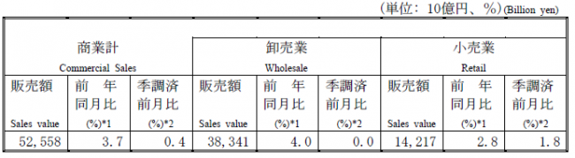 具体的には商業販売額の動向として、卸売業販売額と小売業販売額の動向、そして業態別の販売額の動向として百貨店・スーパー販売額、コンビニエンスストア、家電大型専門店、ドラッグストア、ホームセンターの統計数値が発表される。