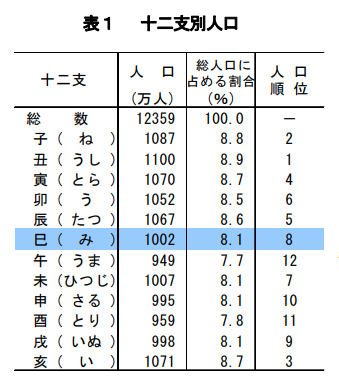 総人口を十二支別にみると、 丑(うし)年生まれが1100万人で最も多く、 子(ね)年1087万人、亥(い)年1071万人と続いており、巳年生まれは8番目となっている。