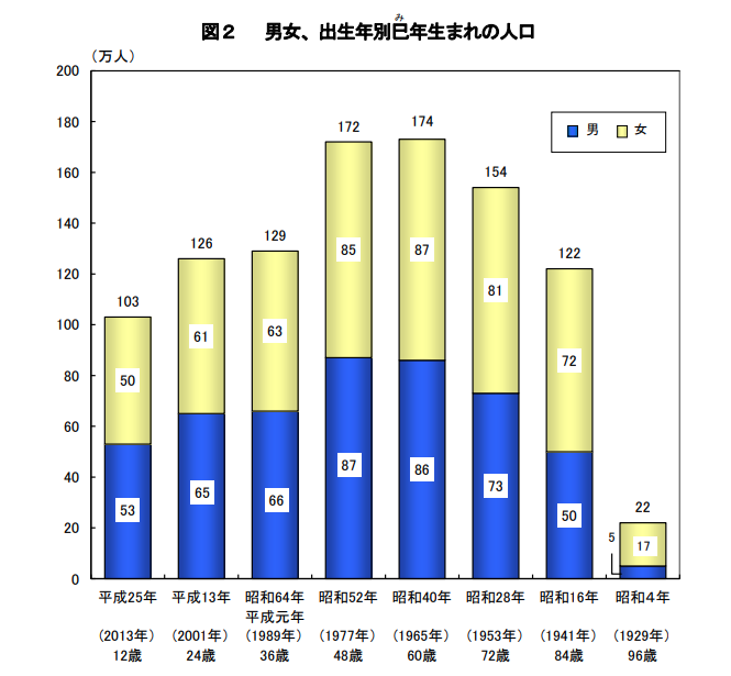 出生年別にみると、昭和40年生まれ(令和7年に60歳になる人)が174万人と最も多い。最も若い平成25年生まれ(同12歳になる人)は103万人で、昭和40年生まれより71万人少ない。まさに少子高齢化。