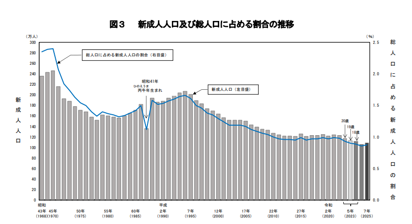 この1年間(令和6年1月~12月)に、新たに成人に達した人口(令和7年1月1日現在18歳の人口)は109万人で、前年と比べると3万人増加している。総人口に占める割合は0.88%。