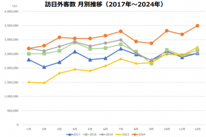 また、2024年の年間訪日外客数は3686万9900人で、前年比では47.1%増、2019年比では15.6%増と、過去最高であった2019 年の3188万2049人を約500万人上回り、年間過去最高を更新した。このうち、23市場のうち計20市場が年間の累計で過去最高を記録した。桜や紅葉のシーズン、夏の学校休暇など、ピークシーズンを中心に各市場が単月での過去最高を更新し、東アジアのみならず東南アジア、欧米豪・中東においても実数を増やしたことが、年間過去最高の更新につながった。