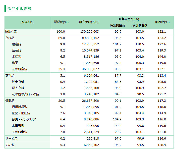 部門別では、売上構成比69.0%の「食料品」が売上高8983億4152万円で、既存店104.5%。構成比20.5%の「住関品」は売上高2663億7590万円で103.9%、構成比5.1%の「衣料品」は662億4641万円で93.3%。衣・食・住の主要3部門は「衣料品」以外が既存店プラスとなった。