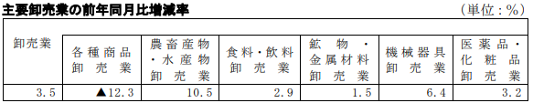 一方、各種商品卸売業が12.3%減、繊維品卸売業が3.3%減、建築材料卸売業が同▲1.8%の減少、家具・建具・じゅう器卸売業が0.5%減となった。