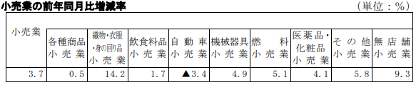小売業を業種別にみると、織物・衣服・身の回り品小売業が14.2%増、無店舗小売業が9.3%増、その他小売業が5.8%増、燃料小売業が5.1%増、機械器具小売業が4.9%増、医薬品・化粧品小売業が4.1%増、飲食料品小売業が1.7%増、各種商品小売業(百貨店など)が0.5%増と軒並みプラス。