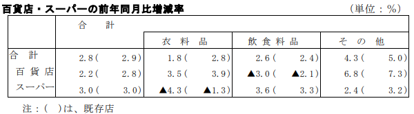 既存店では、百貨店・スーパーは2.9%増。百貨店は2.8%増、スーパーは3.0%増加だった。
