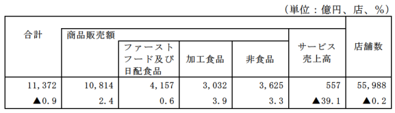 コンビニエンスストアの商品販売額およびサービス売上高は、1兆1372億円で0.9%減。店舗数は5万5988店で0.2%減少。商品別ではファストフードおよび日配食品が4157億円で0.6%増加、加工食品が3032億円で3.9%増加。非食品が3625億円で3.3%増加となった。サービス売上高は557億円で39.1%の減少となった。