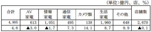 家電大型専門店の販売額は4905億円、前年同月比4.8%増加した。店舗数は2670店で0.1%減っている。