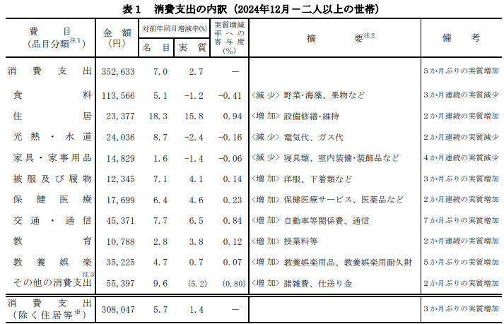 総務省統計局が2024年12月の「家計調査報告」を発表した。