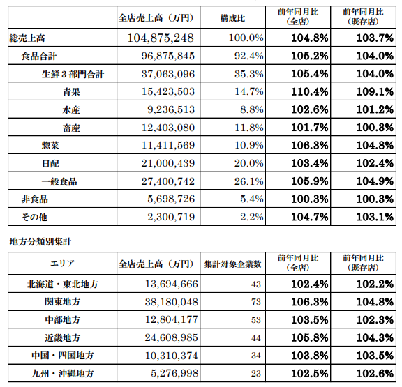食品のうち、生鮮3部門は3706億3096万円、5.4%増(4.0%増)。青果が1542億3503万円、10.4%増(9.1%増)、水産が923億6513万円、2.6%増(1.2%増)、畜産が1240億3080万円、1.7%増(0.3%増)。惣菜は1141億1569万円で6.3%増(4.8%増)、日配は2100億0439万円、3.4%増(2.4%増)、一般食品が2740億0742万円、5.9%増(4.9%増)。