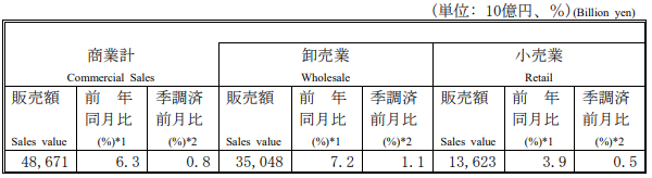 1月の商業販売額は48兆6710億円、前年同月比6.3%増加した。このうち、卸売業は35兆480億円で7.2%増、小売業は13兆6230億円で3.9%増加した。なお、商業販売額の季節調整済前月比は0.8%上昇した。卸売業は1.1%増、小売業は0.5%増となった。