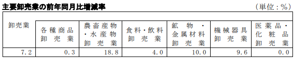 金属材料卸売業が10.0%増、機械器具卸売業が9.6%増、化学製品卸売業が7.2%増、その他の卸売業が5.3%増、食料・飲料卸売業が4.0%増、各種商品卸売業が0.3%増、繊維品卸売業が0.0%で横ばい、医薬品・化粧品卸売業が0.0%横ばい。