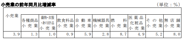 小売業を業種別にみると、燃料小売業が8.7%増、無店舗小売業が8.0%増、自動車小売業が5.9%増、その他小売業が5.2%増、医薬品・化粧品小売業が4.9%増、機械器具小売業が2.8%増、各種商品小売業(百貨店など)が1.3%増、織物・衣服・身の回り品小売業が1.0%増、飲食料品小売業が0.9%増となった。
