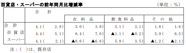 商品別では衣料品は3.0%増、飲食料品は5.1%増、その他は1.8%増となった。