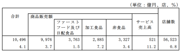 商品別ではファストフードおよび日配食品が3763億円で1.5%増、加工食品が2885億円で7.2%増、非食品が3327億円の3.4%増で、商品販売額全体では9976億円、3.7%増となった。またサービス売上高は521億円で11.2%増加した。