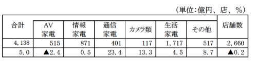 通信家電は401億円、23.4%の大幅増。カメラ類が117億円で13.3%増と好調。