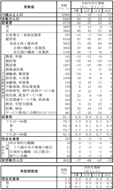 1月の就業者数は6779万人。前年同月に比べて65万人増加した。30カ月連続のプラスとなった。男女の内訳では男性が3687万人、女性が3092万人。就業率は61.7%、15~64歳の就業率は79.7%。