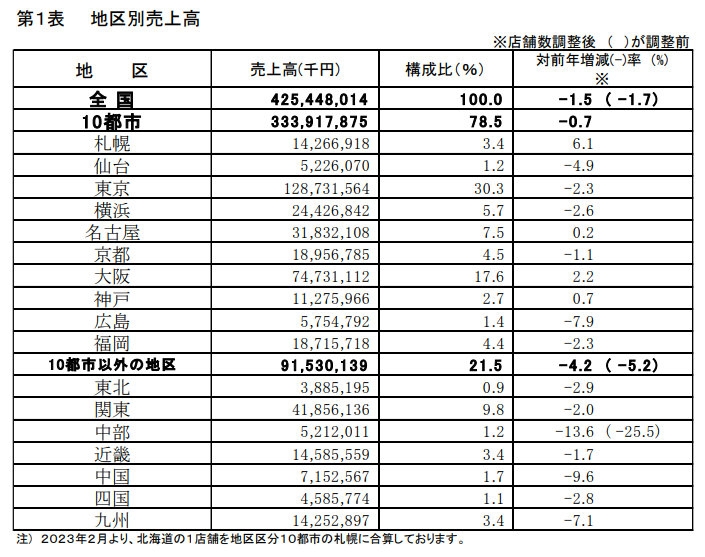 地区別では、主要10都市で0.7%減とマイナスに転じた。4地区で対前年プラスで、札幌は6.1%増、大阪では2.2%増の伸長。一方で、仙台は4.9%減、広島は7.9%減だった。