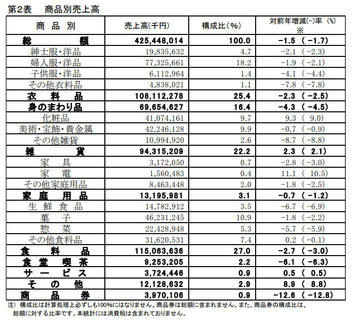 商品別では主要5品目のうち、雑貨をのぞく4品目がマイナスだった。雑貨は943億1520万円で2.3%増、一方で身のまわり品が696億5462万円で4.3%減、衣料品は1081億1122万円で2.3%減だった。