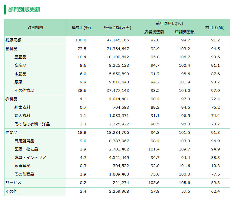 部門別売上高は、「食料品」が7136億4647万円で、既存店103.2%。「住関品」は1828億4796万円で101.5%、「衣料品」は401億4481万円で97.0%。「サービス」は22億1274万円で108.6%、「その他」は325億9968万円で57.5%だった。