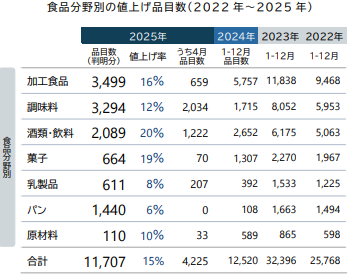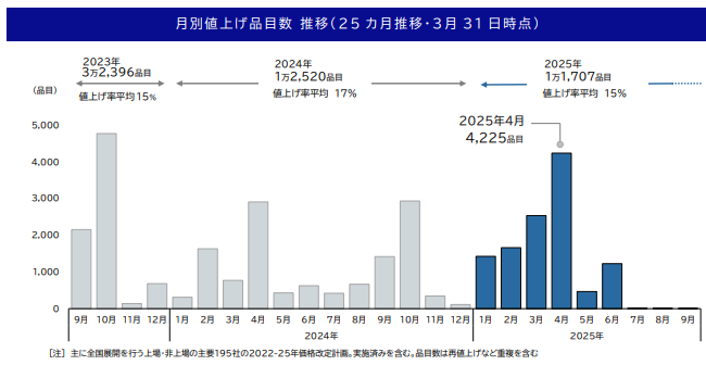 2025 年通年での値上げは、9 月までの発表分で累計1万1707 品目。前年実績(1万2520品目)の9割超に到達していて、前年に比べて値上げペースが早まっている。1 回当たり平均値上げ率は 15%と、前年(17%)に比べ低下傾向で推移。