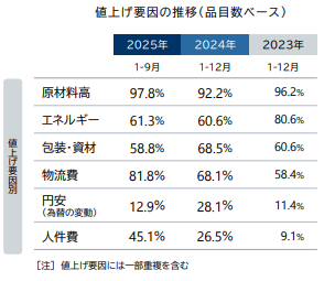 2025 年における要因のうち、最も大きいものは「原材料高」(97.8%)。要因別の集計を開始した 23 年以降で最も高い水準。トラックドライバーの時間外労働規制などが要因となった輸送コストの上昇分を価格に反映する「物流費」由来の値上げは 81.8%を占め、前月調査時(80.9%)から割合が増加した。
