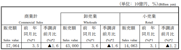 3月の商業販売額は57兆0640億円、前年同月比3.5%増加した。このうち、卸売業は43兆円で3.6%増、小売業は14兆0630億円で3.1%増加した。なお、商業販売額の季節調整済前月比は1.6%低下した。卸売業は1.6%、小売業は1.2%それぞれ低下した。