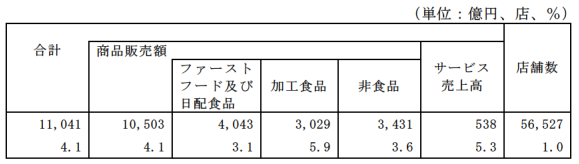 商品別ではファーストフードおよび日配食品が4043億円で3.1%増、加工食品が3029億円で5.9%増、非食品が3431億円で3.6%増となったため、商品販売額は1兆0503億円、4.1%増となった。また、サービス売上高は538億円、5.3%増加した。
