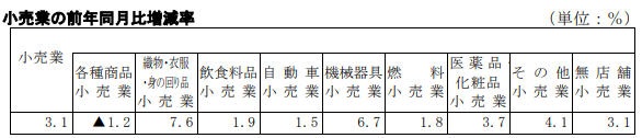 一方、各種商品小売業(百貨店など)が1.2%減少した。