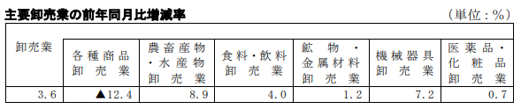 一方、各種商品卸売業が12.4%減、繊維品卸売業が4.0%減、建築材料卸売業が1.5%減、衣服・身の回り品卸売業が1.4%減となった。