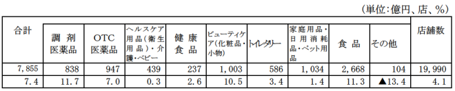 商品別でみると、調剤医薬品が838億円で11.7%増、食品が2668億円で11.3%増、ビューティケア (化粧品・小物)が1003億円で10.5%増、OTC医薬品が947億円で7.0%増、トイレタリーが586億円で3.4%増、健康食品が237億円で2.6%増、家庭用品・日用消耗品・ペット用品が1034億円で1.4%増、ヘルスケア用品 (衛生用品)・介護・ベビーが439億円で0.3%の増加となった。