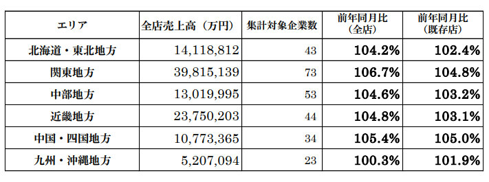 エリア別では、北海道・東北地方が4.2%増、関東地方が6.7%増、中部地方が4.6%増、近畿地方が4.8%増、中国・四国地方が5.4%増、九州・沖縄地方が0.3%増。