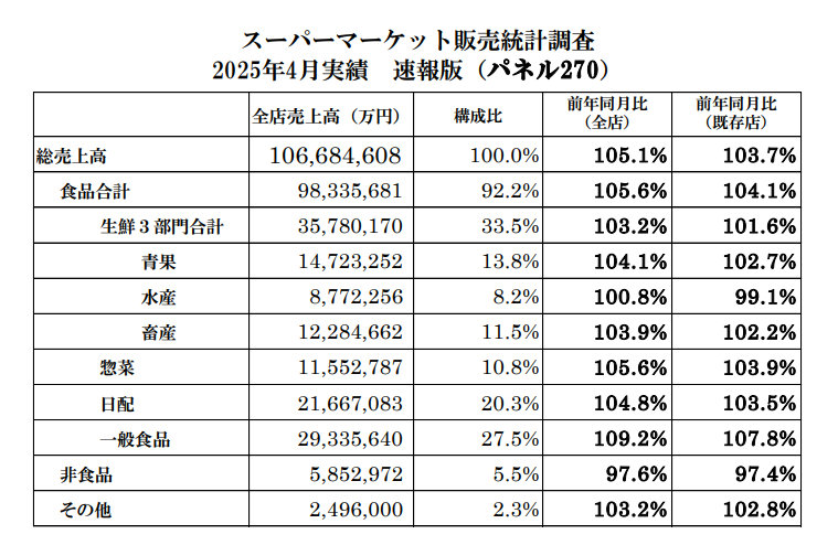 一般社団法人日本スーパーマーケット協会(JSA)、オール日本スーパーマーケット協会(AJS)、一般社団法人全国スーパーマーケット協会(NSAJ)の3団体が、2025年4月の販売実績速報を発表した。
