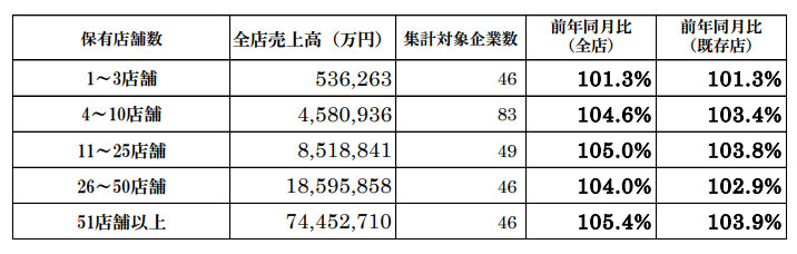また保有店舗数別では、1~3店舗が1.3%増。4~10店舗は4.6%増、11~25店舗は5.0%増、26~50店舗が4.0%増、51店舗以上が5.4%増だった。