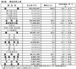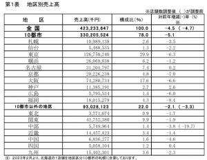 地区別では、主要10都市が5.1%減で、3カ月連続のマイナス。前年の免税売上高大幅増の反動減が影響し、名古屋、神戸を除く8地区でマイナスとなった。また10都市以外の地区は2.1%減。四国を除く6地区でマイナス、7カ月連続で減少した。入店客数は前年同水準だが、買上げ率の低下により購買客数が減少した。