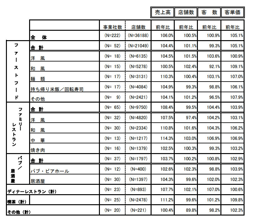 ファミリーレストラン業態の売上げは108.4%。コスパ重視の消費が続く一方、大型連休期間は高価格メニューも堅調と、消費の二極化が強まった。また低価格業態が引き続き好調で、「洋風」は107.5%、「和風」は110.8%、「中華」は114.3%となった。