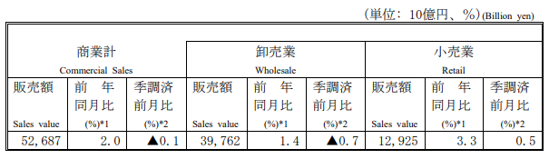 4月の商業販売額は52兆6870億円、前年同月比2.0%増加した。このうち、卸売業は39兆7620億円で1.4%増、小売業は12兆9250億円で3.3%増加した。なお、商業販売額の季節調整済前月比は0.1%低下した。卸売業は0.7%低下、小売業は0.5%上昇した。