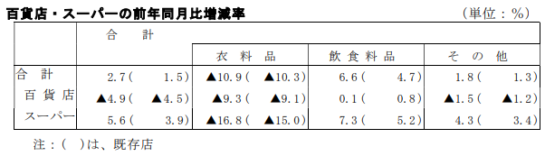 商品別にみると、衣料品は10.9%減、飲食料品は6.6%増、その他は1.8%増。