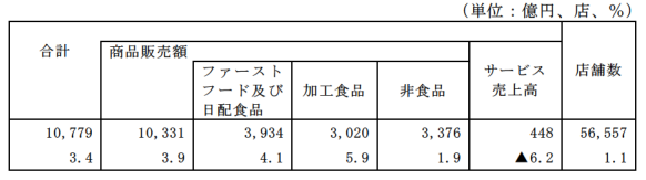 商品別ではファーストフードおよび日配食品が3934億円で4.1%増、加工食品が3020億円で5.9%増、非食品が3376億円で1.9%増となった。商品販売額は1兆0331億円、3.9%増となった。また、サービス売上高は448億円、6.2%減少した。