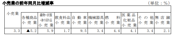 小売業を業種別にみると、自動車小売業が9.5%増、織物・衣服・身の回り品小売業が5.9%増、燃料小売業が4.4%増、医薬品・化粧品小売業4.1%増、飲食料品小売業1.7%増となった。各種商品小売業が5.2%減少した。