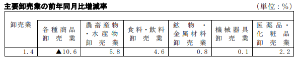 卸売業を業種別にみると農畜産物・水産物卸売業5.8%増、食料・飲料卸売業4.6%増、医薬品・化粧品卸売業2.2%増となった。一方、各種商品卸売業が10.6%減となった。
