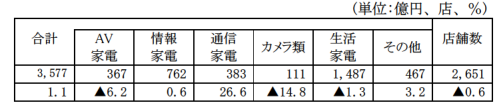 4月の家電大型専門店の販売額は3577億円、前年同月比1.1%増加した。店舗数は2651店で0.6%減っている。