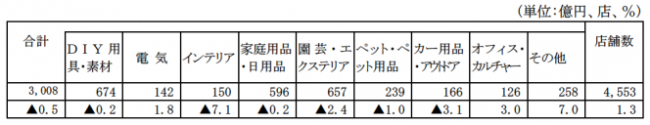 商品別にみると、園芸・エクステリアが657億円で2.4%減、DIY用具・素材が674億円で0.2%減、カー用品・アウトドアが166億円で3.1%減、家庭用品・日用品が596億円で0.2%減、インテリアは150億円で7.1%減、ペット・ペット用品が239億円で1.0%減となった。