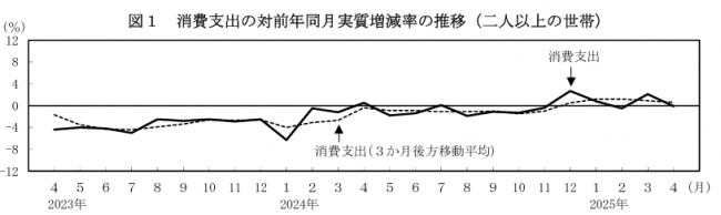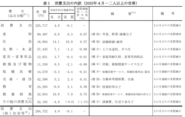 4月の消費支出(二人以上の世帯)は、 1世帯当たり32万5717円。前年同月比は実質で0.1%減少、名目で4.0%増加した。季節調整値では前月比実質0.4%増加した。