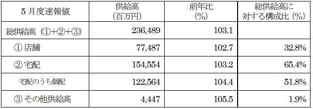 総供給高は2364億8900万円で、前年同月比は3.1%増加した。店舗供給高は774億8700万円で2.7%増、宅配は1545億5400万円で3.2%増。また、その他供給高は44億4700万円で5.5%増だった。